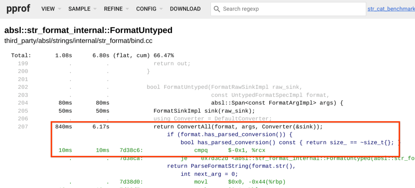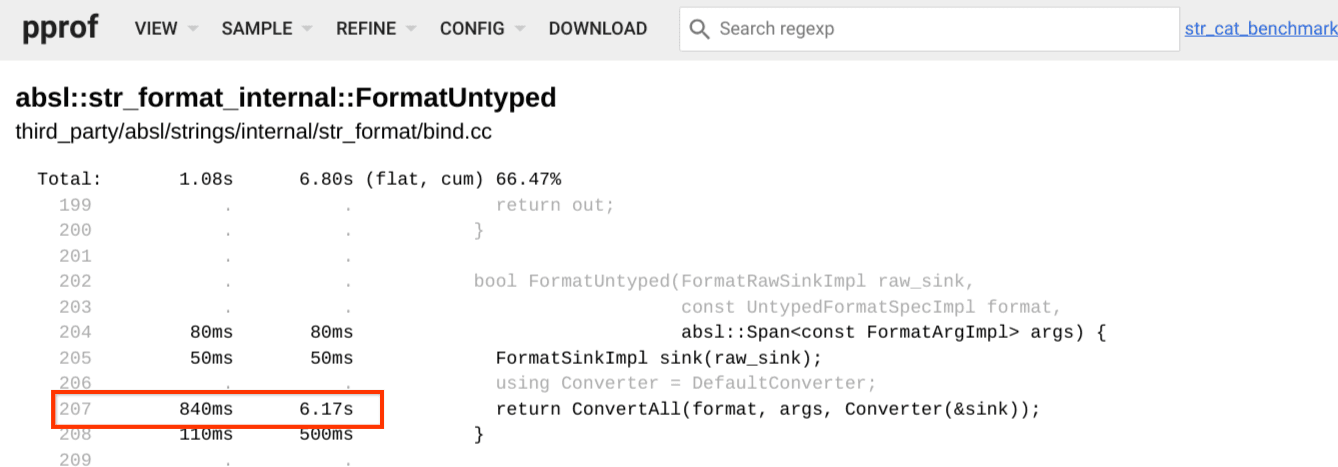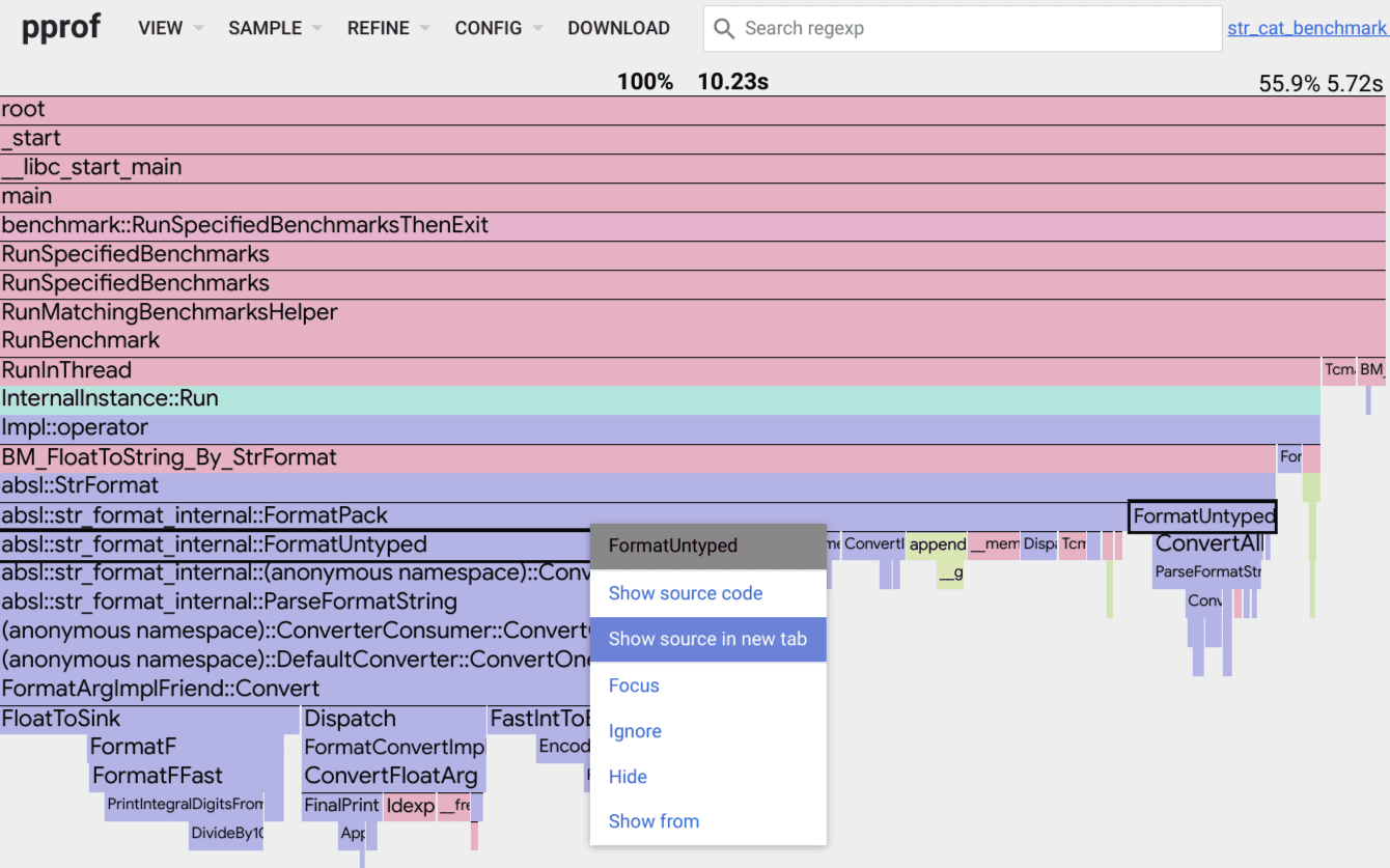 pprof 的火焰图扩展了传统的模型: 当一个函数被点击时,图会筛选出所有调用了该函数的堆栈数据。因此,单击任何 FormatUntype 框都会显示最终调用了 FormatUntype 的堆栈信息: