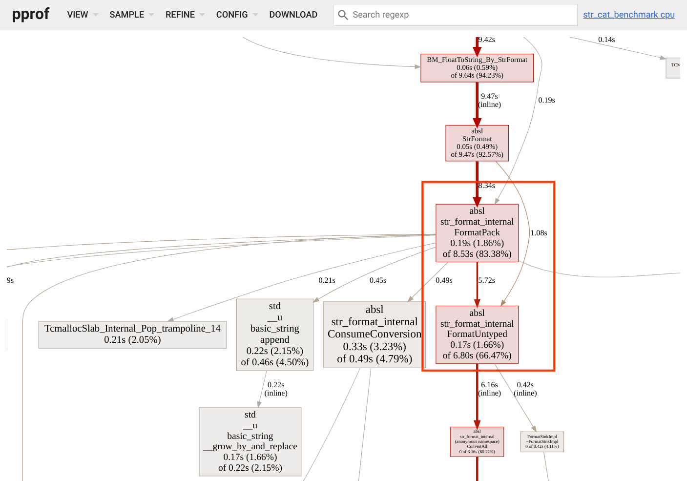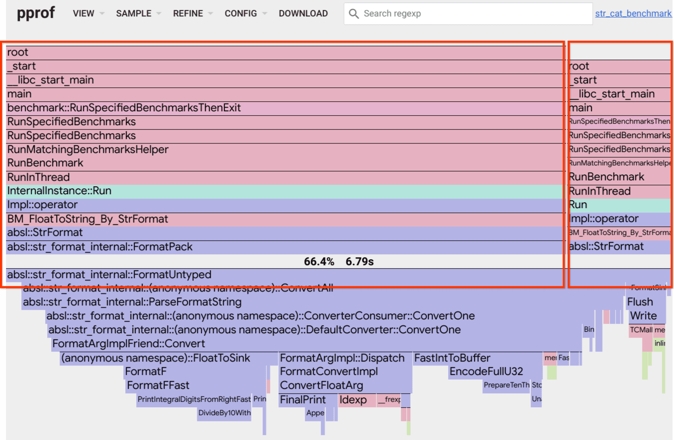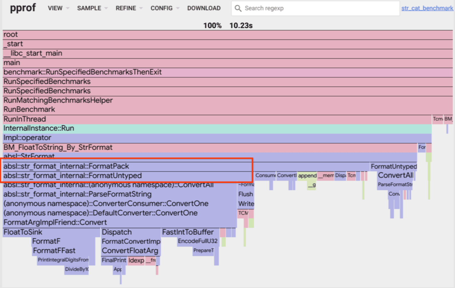 例如,这里我们看到 FormatPack 正好位于 FormatUntype 之上,这表明前者调用后者。FormatUntype 的宽度对应于此调用占用的时间分数。