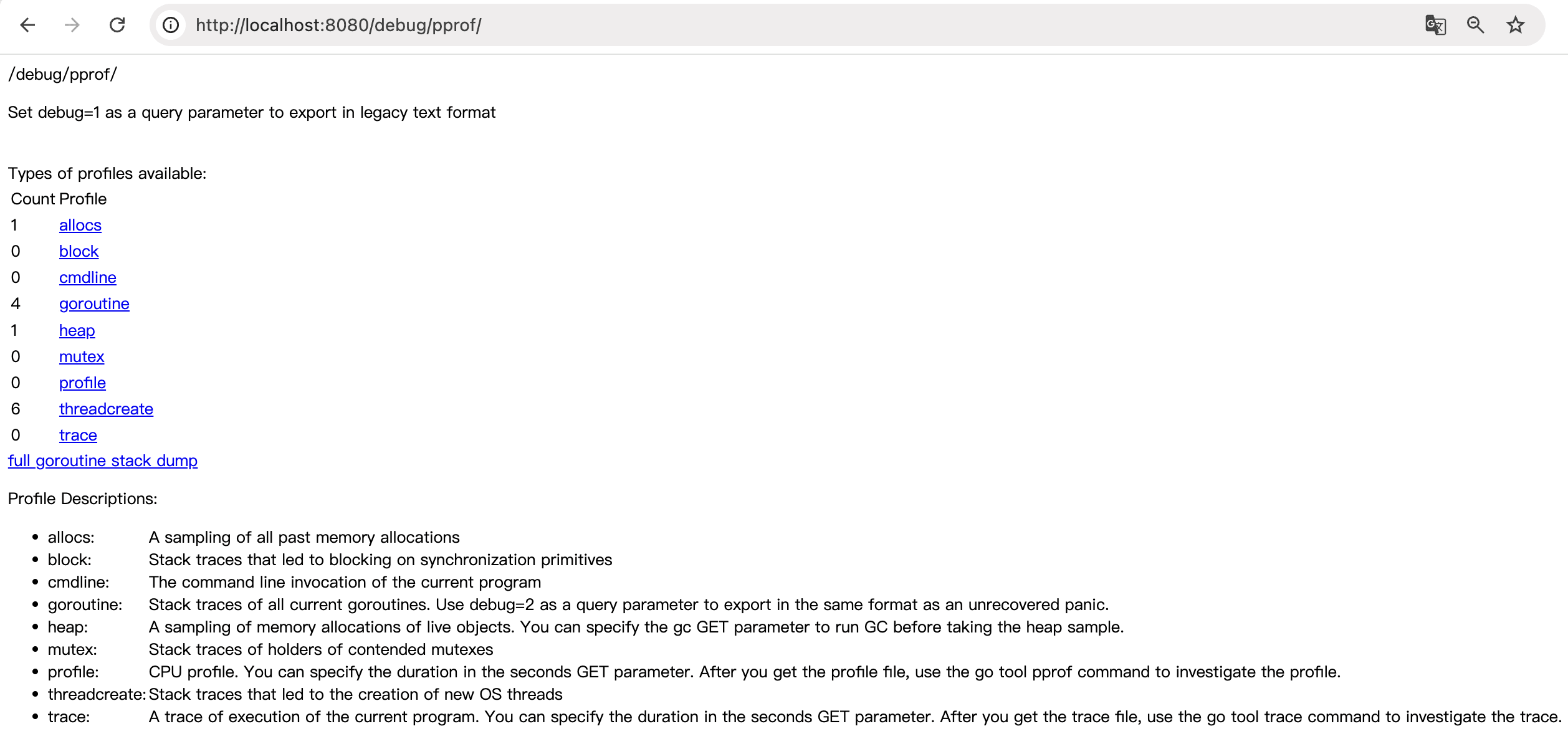 go tool pprof http://localhost:8080/debug/pprof/goroutine