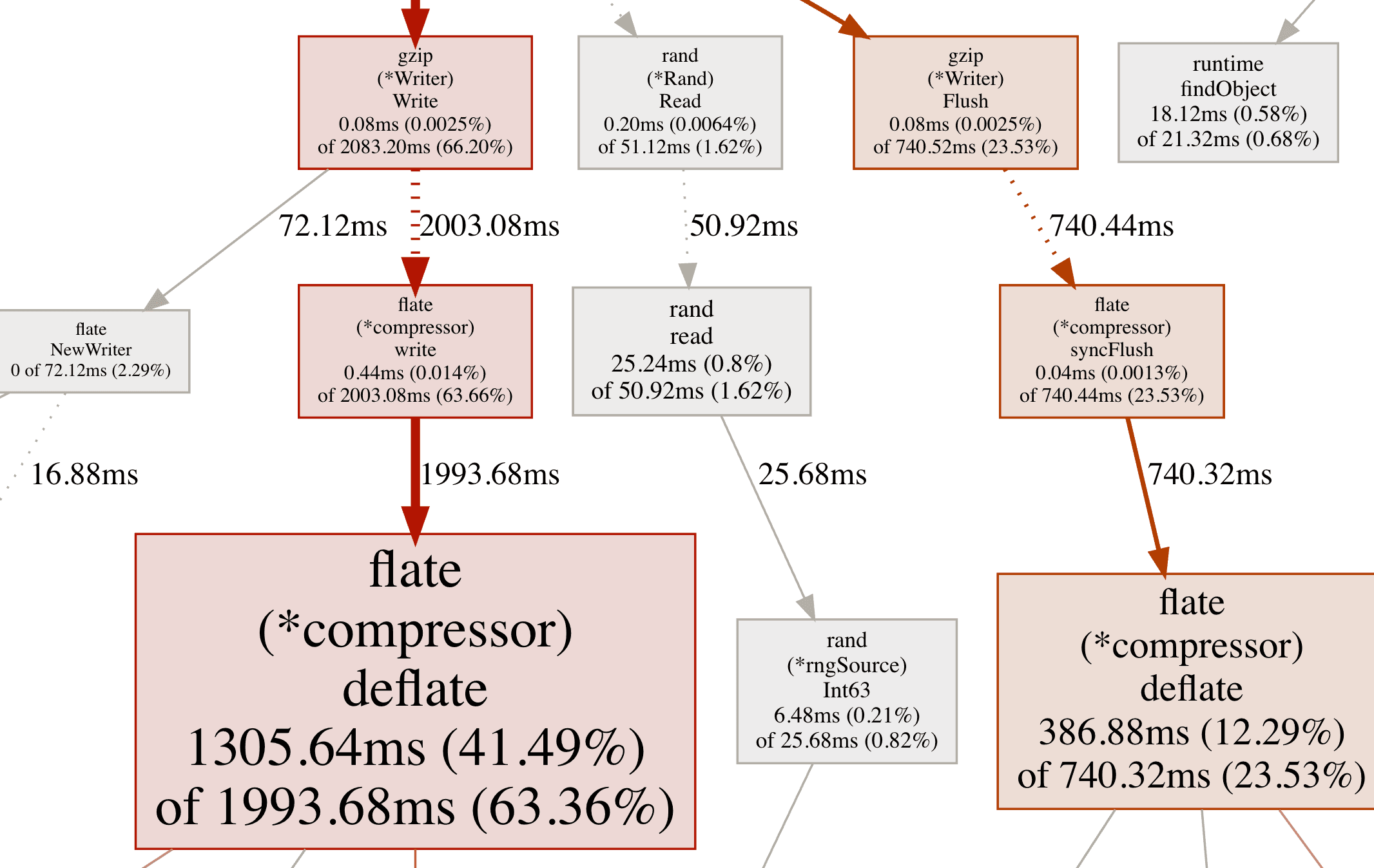 - (*compressor).deflate 有一个较大的 flat 值和一个较大的 cum 值,因为字体大且节点是红色的。