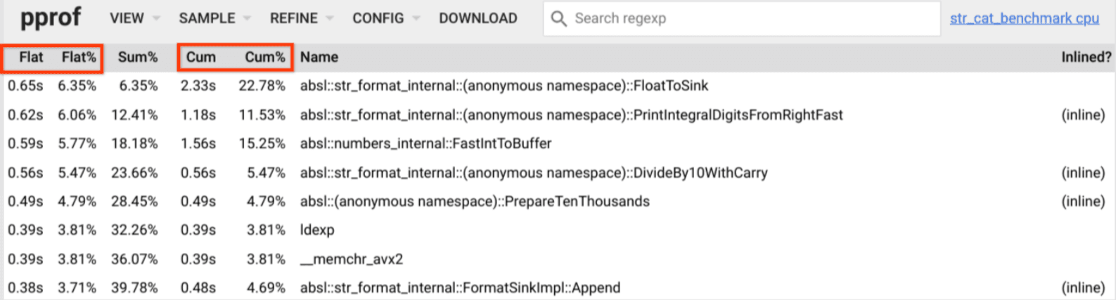 该表最初按照 Flat 的递减排序,单击 Cum 表头将按其递减排序。